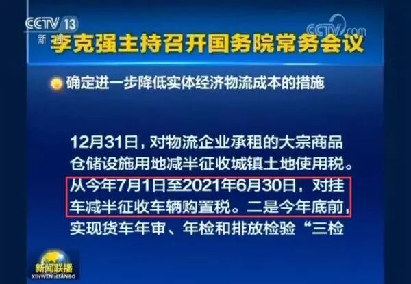 财政部联合税务总局、工业和信息化部发布通知,自2018年7月1日至2021年6月30日,对购置挂车减半征收车辆购置税。