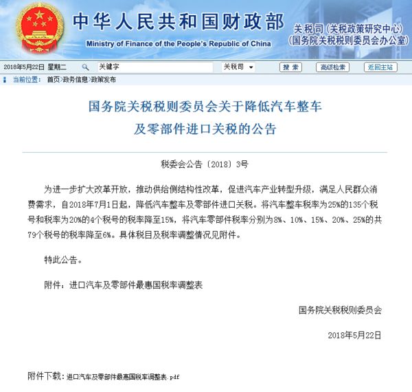 财政部公告:2018年7月1日起,降低汽车整车及零部件进口关税。将汽车整车税率为25%的135个税号和税率为20%的4个税号的税率降至15%,将汽车零部件税率分别为8%、10%、15%、20%、25%的共79个税号的税率降至6%。