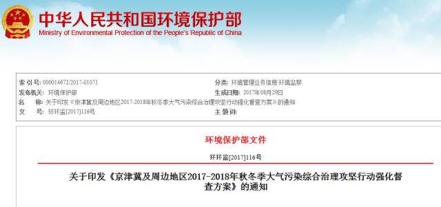 近日,环保部印发《京津冀及周边地区2017-2018年秋冬季大气污染综合治理攻坚行动强化督查方案》(以下简称“《方案》”)。《方案》指出,为进一步保障京津冀及周边地区秋冬季环境空气质量,更加深入推进大气环境执法检查工作,环保部将于2017年9月1日至2018年3月29日,分两个阶段共15轮次,对京津冀大气污染传输通道城市("2+26"城市)的大气污染综合治理任务(清单见督查内容)进行督查。